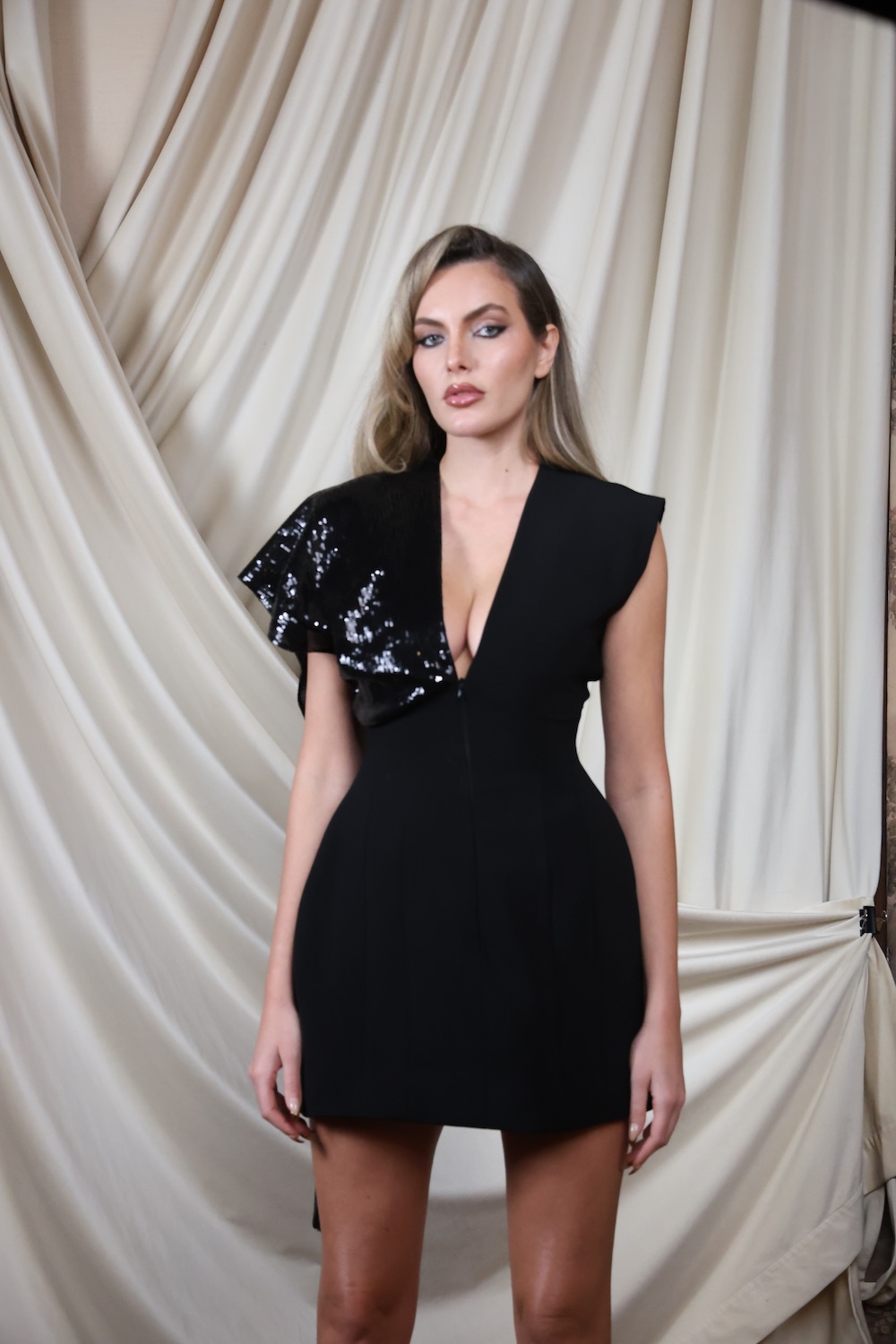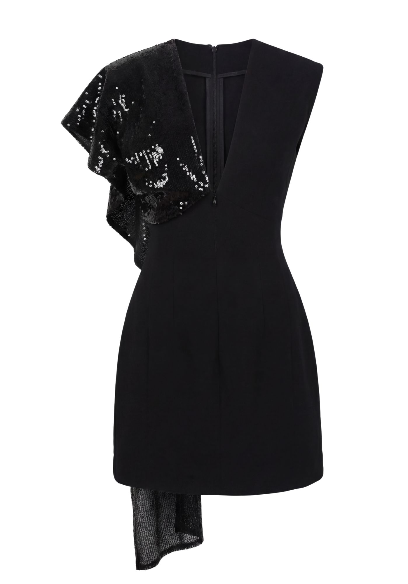 A structured yet fluid asymmetric mini dress with a deep V-neckline.