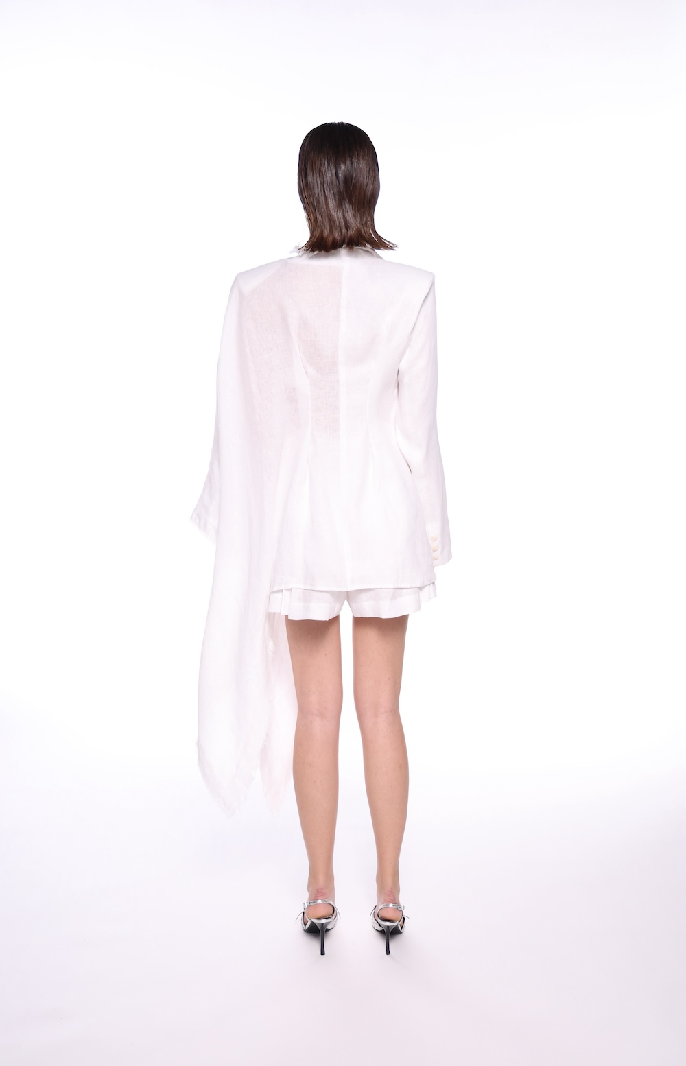 One side features a classic sleeve and a clean, tailored collar. The other side contrasts with a flowing cape-style sleeve and a softly ruched collar finished with raw-edge detailing.