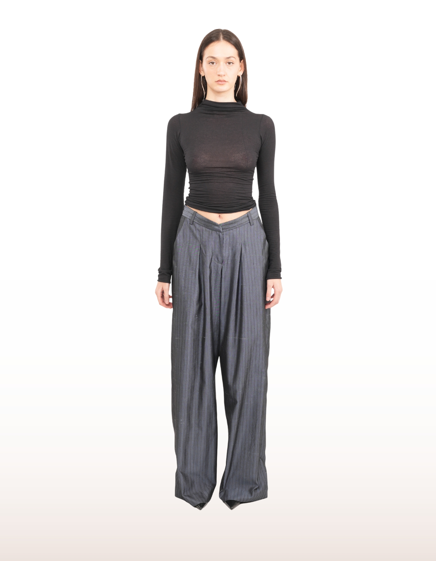 Trousers tailored from lustrous shantung with a subtle pinstripe texture.