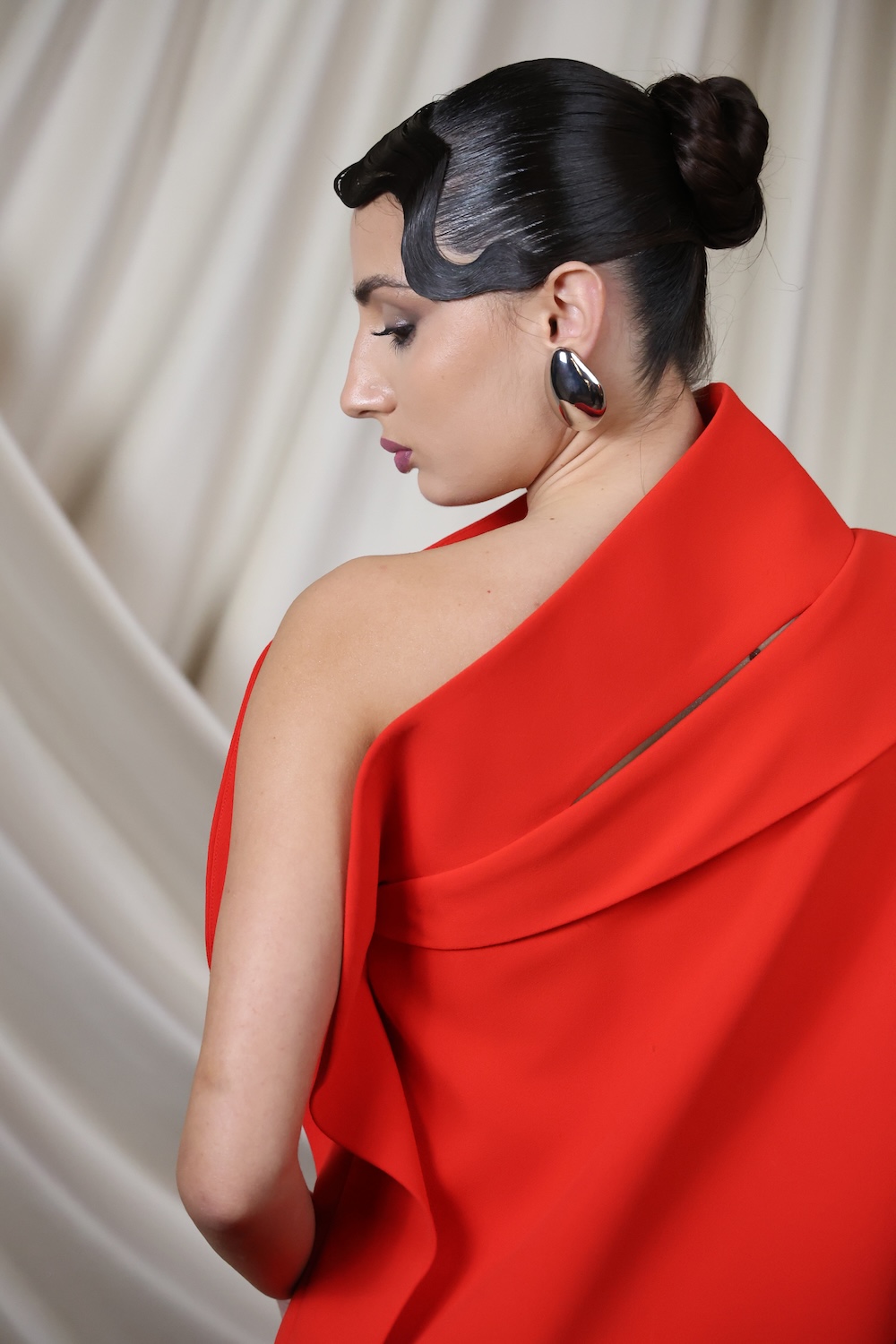 A sculptural one-shoulder mini dress in vibrant red, featuring an asymmetric draped neckline, fluid sleeve detail, and a clean A-line silhouette. Crafted from structured crepe and finished with a discreet side hidden zipper for a smooth, modern fit—perfect for evening events and statement occasions.