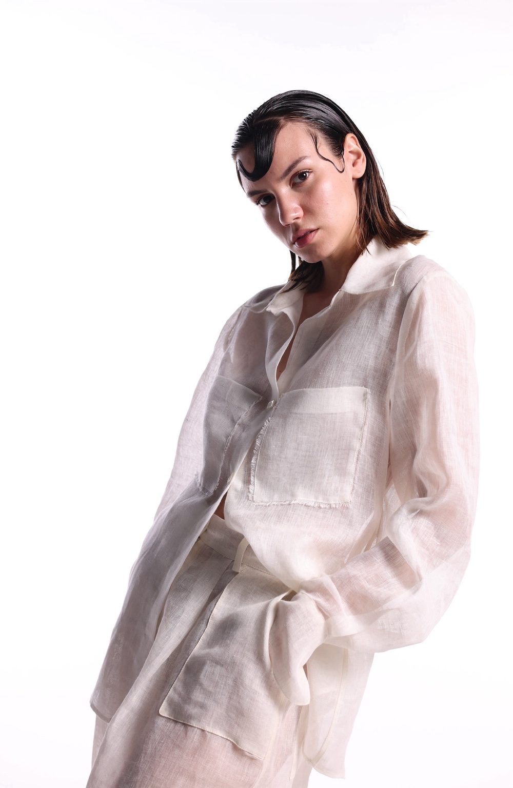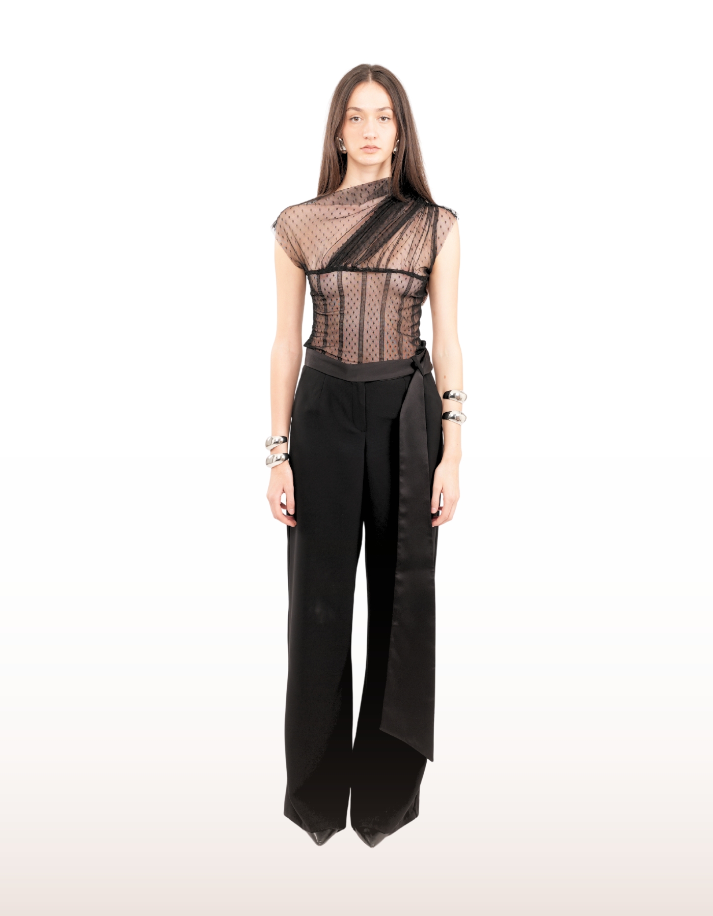 Sleeveless top crafted from soft dotted tulle, featuring sheer vertical lace panels and a lightly frayed neckline. Designed to slip on effortlessly without closures, combining delicate texture with easy wear.