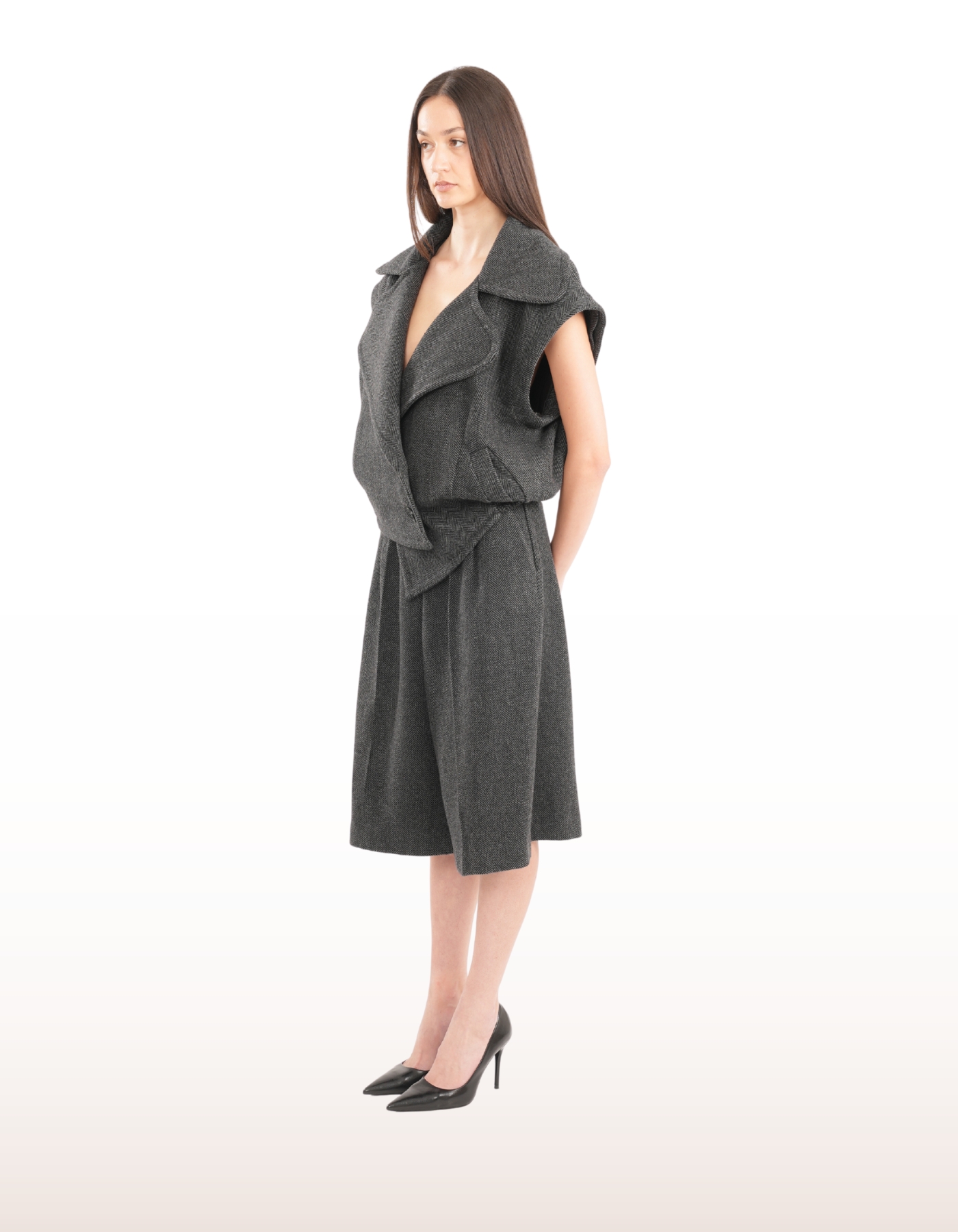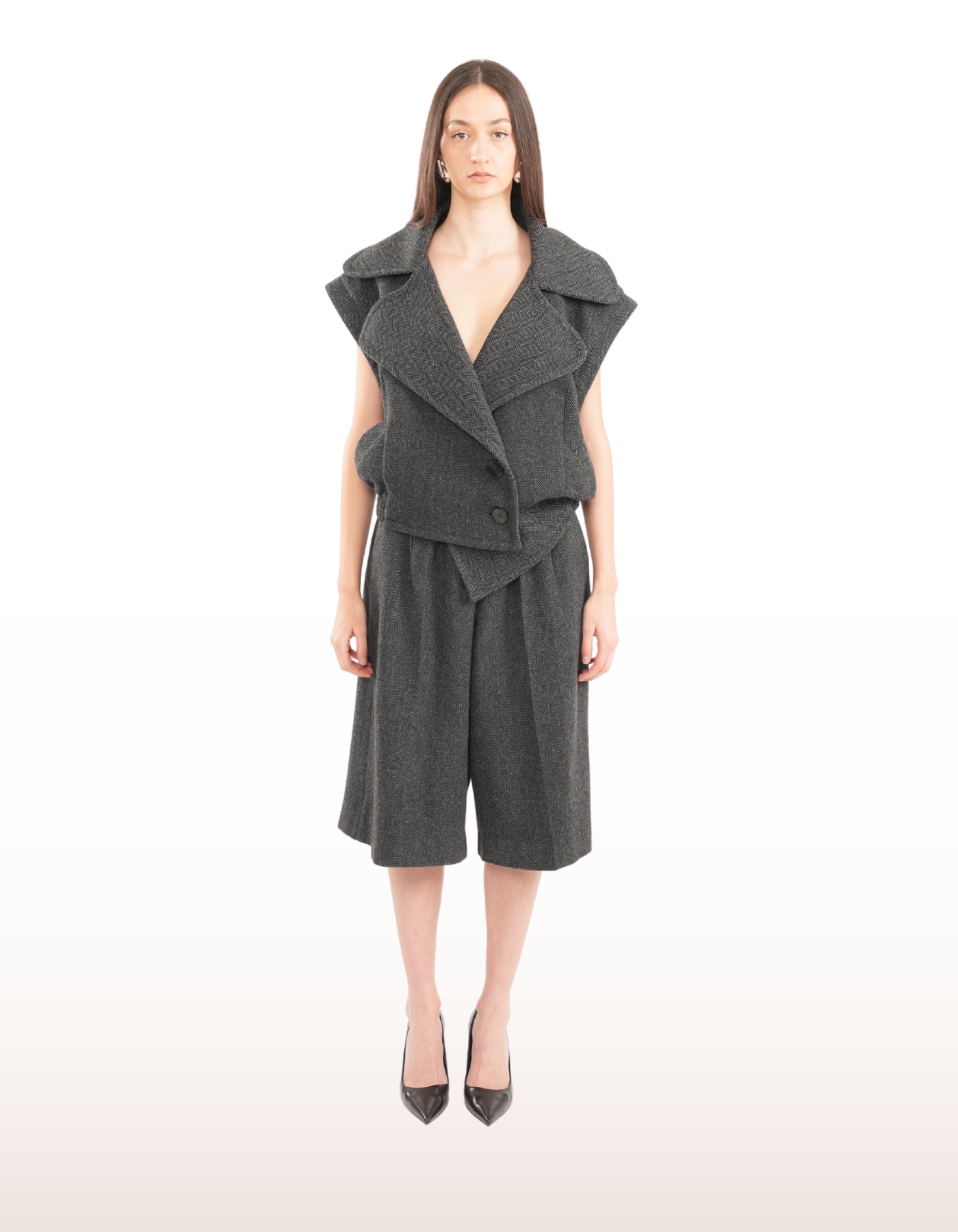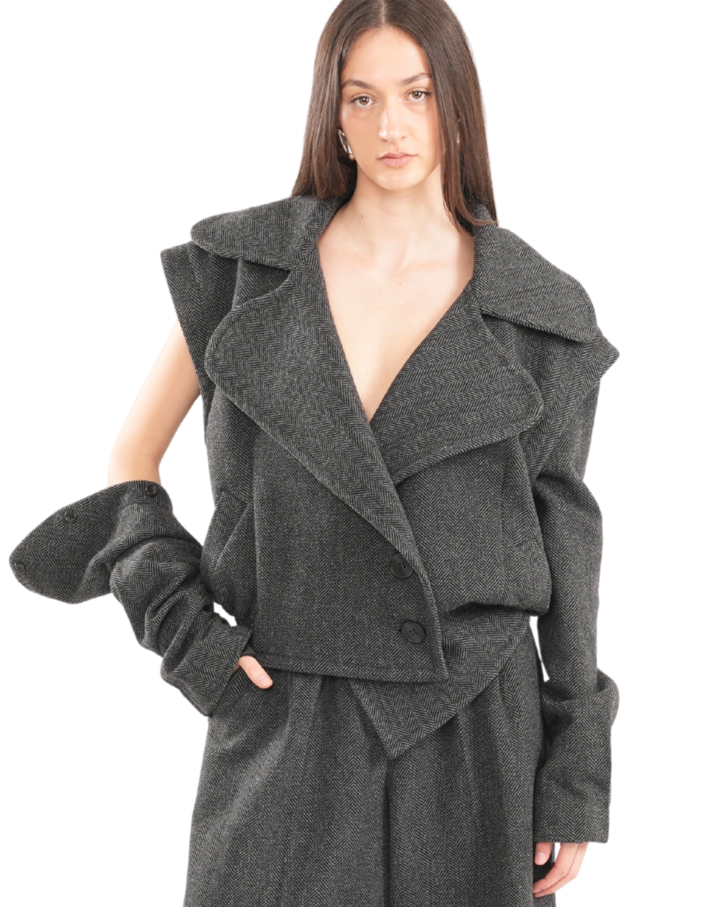 Tailored from pure wool, this oversized short jacket features bold rounded lapels and a sculptural silhouette. Designed with a double-breasted front, button closure, and flap pockets. The removable sleeves, attached with buttons, allow for versatile styling and layered wear. Fits oversize, if you want it for a standard fit, order a size down.