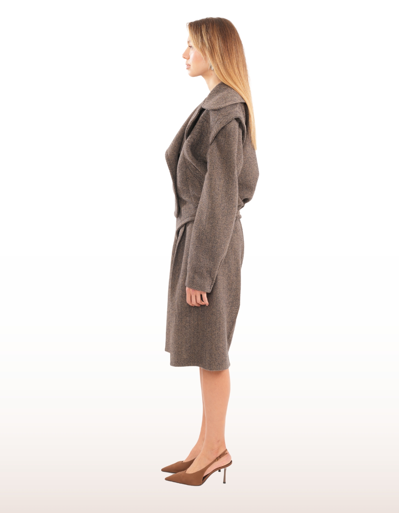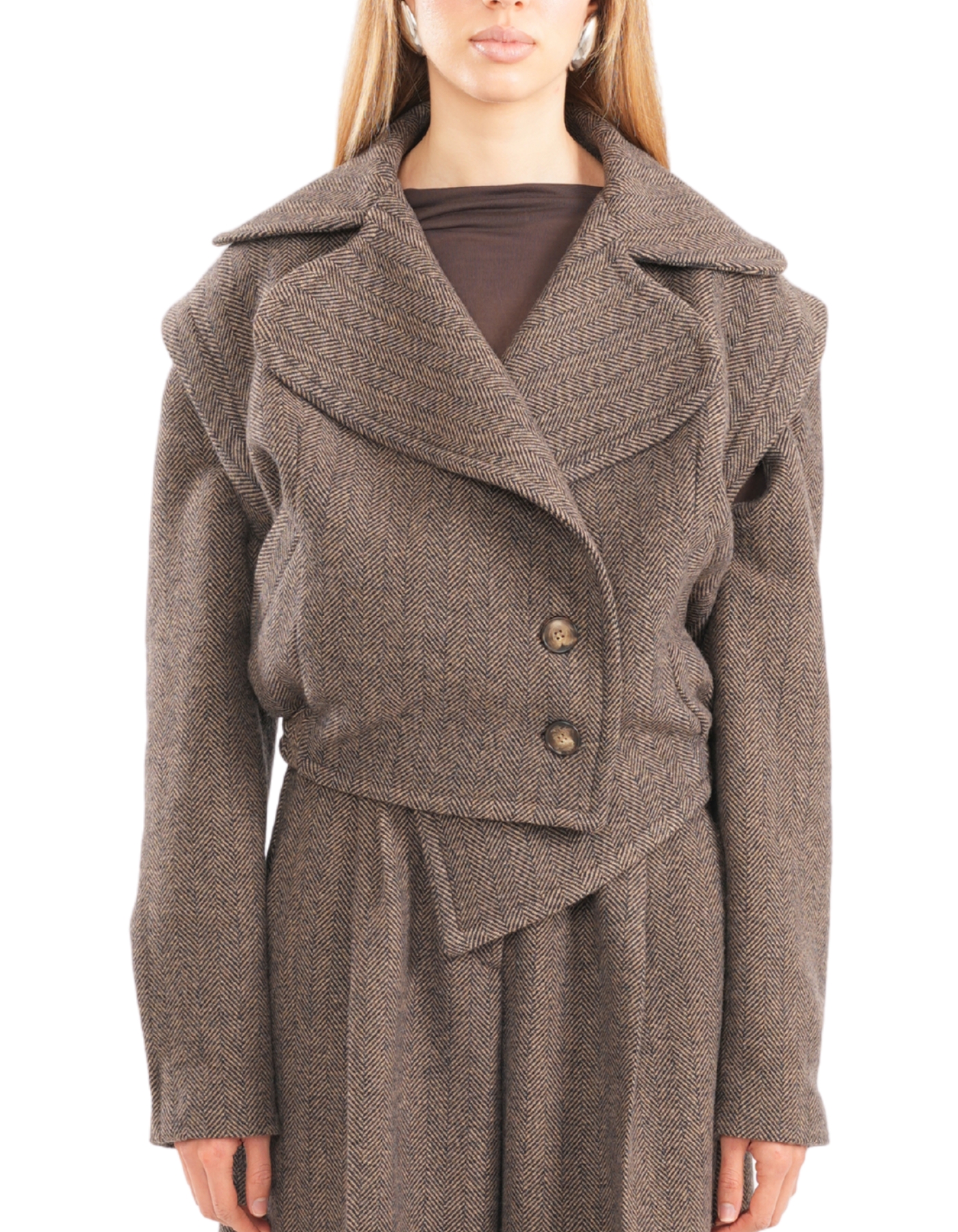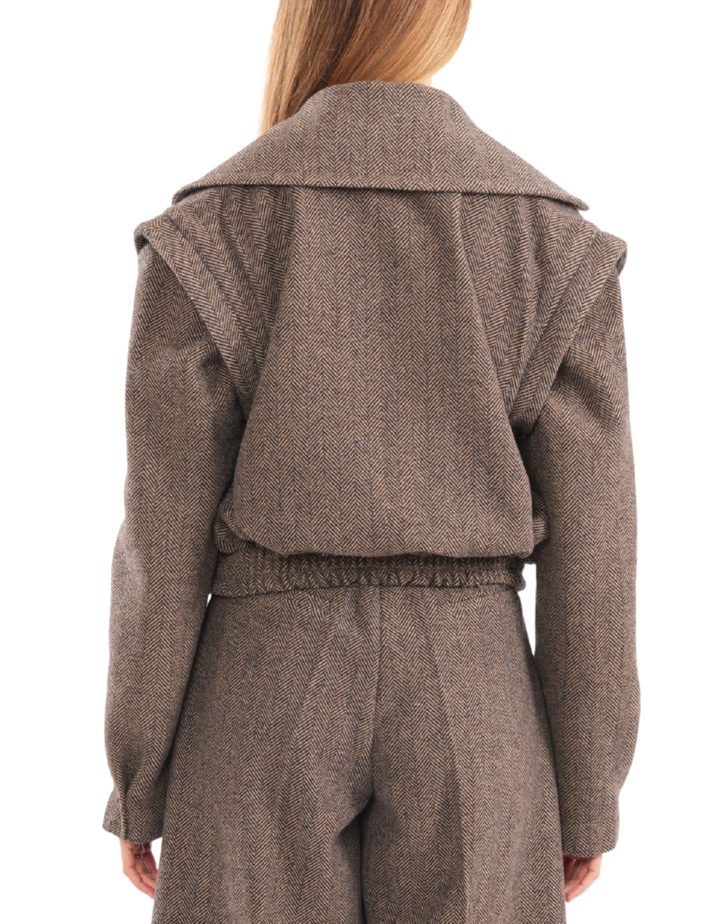 Tailored from pure wool, this oversized short jacket features bold rounded lapels and a sculptural silhouette. Designed with a double-breasted front, button closure, and flap pockets. The removable sleeves, attached with buttons, allow for versatile styling and layered wear. Fits oversize, if you want it for a standard fit, order a size down.