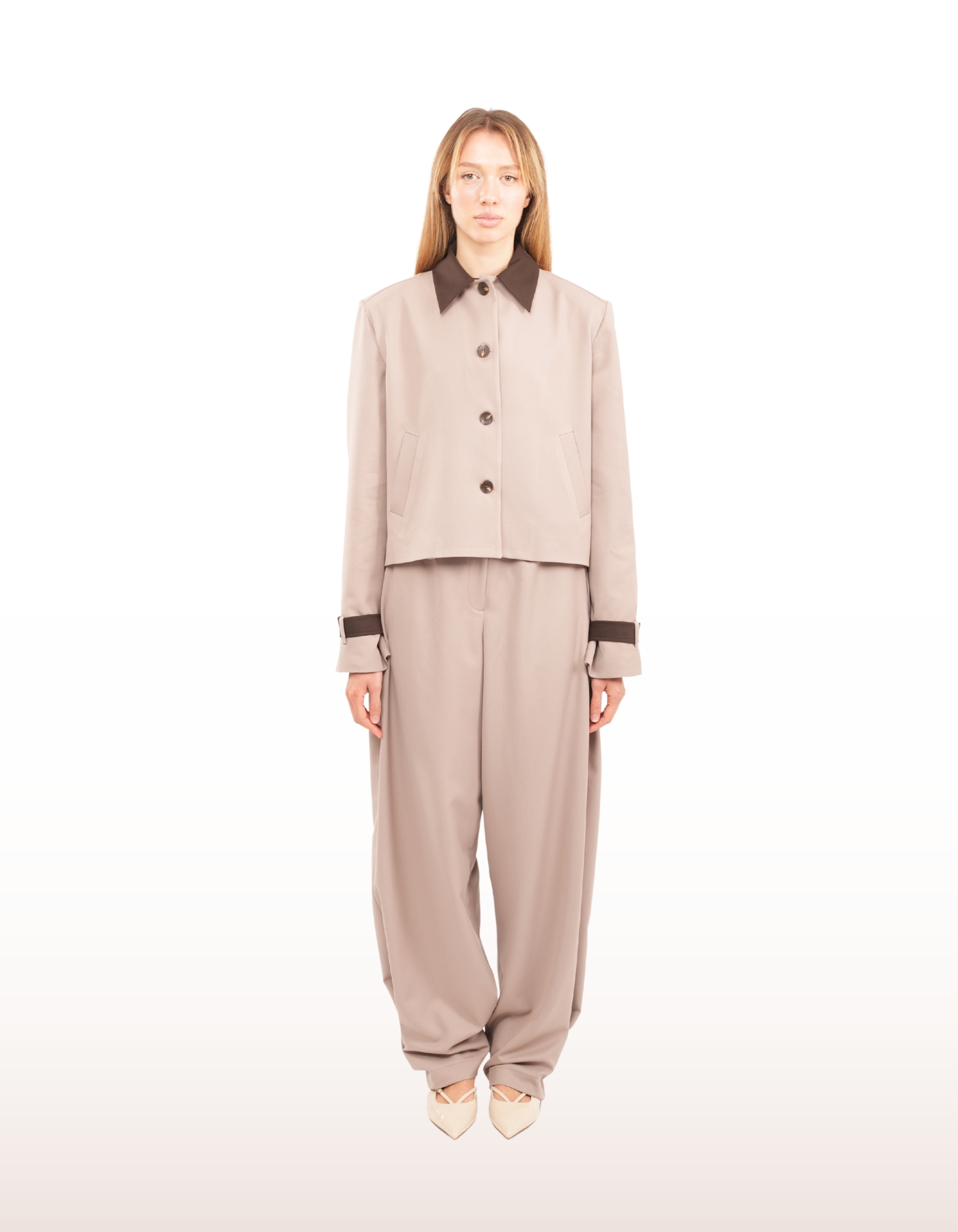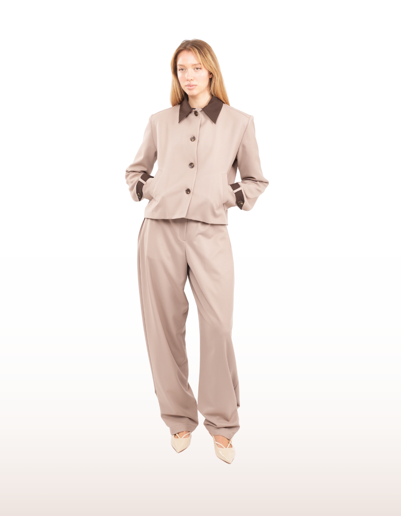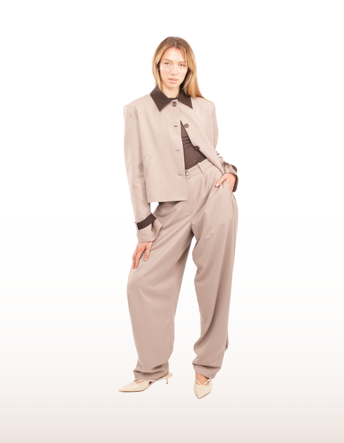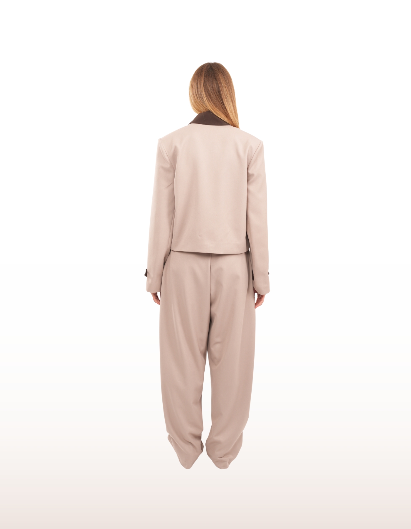 Cropped tailored jacket featuring a contrasting collar and sleeve stripe. Designed with a structured silhouette and clean lines, it embodies a modern, refined edge.