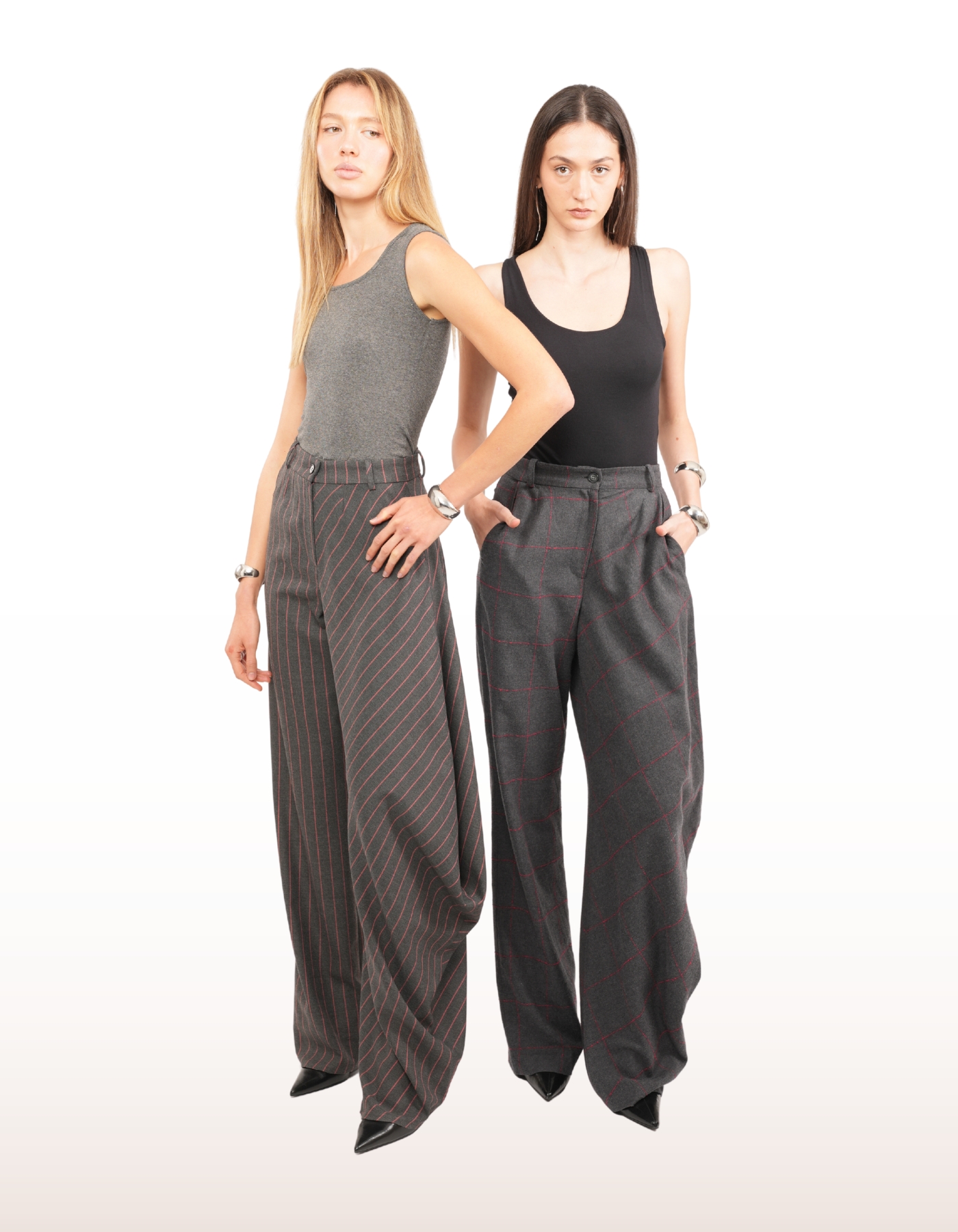 Asymmetric leg design: one draping naturally, the other sculpted with a folded panel for a fluid, architectural silhouette.