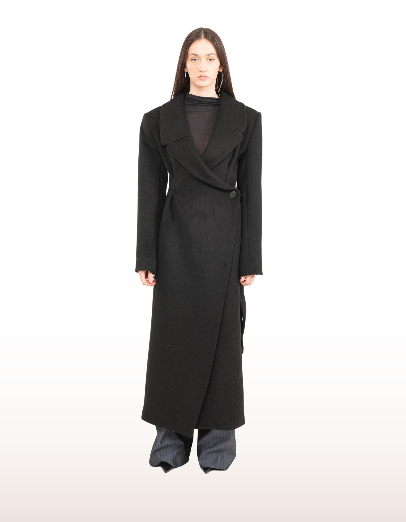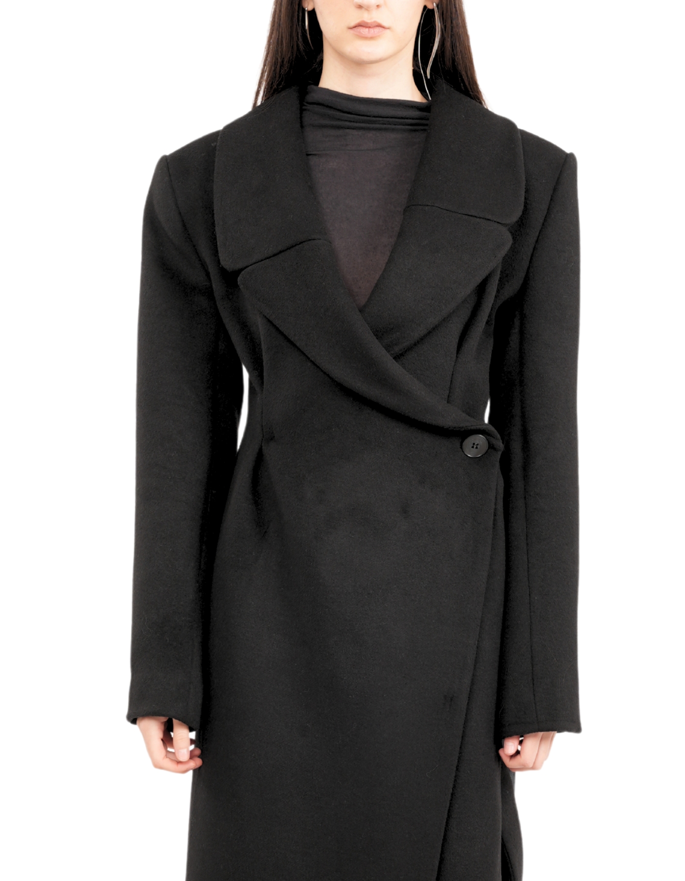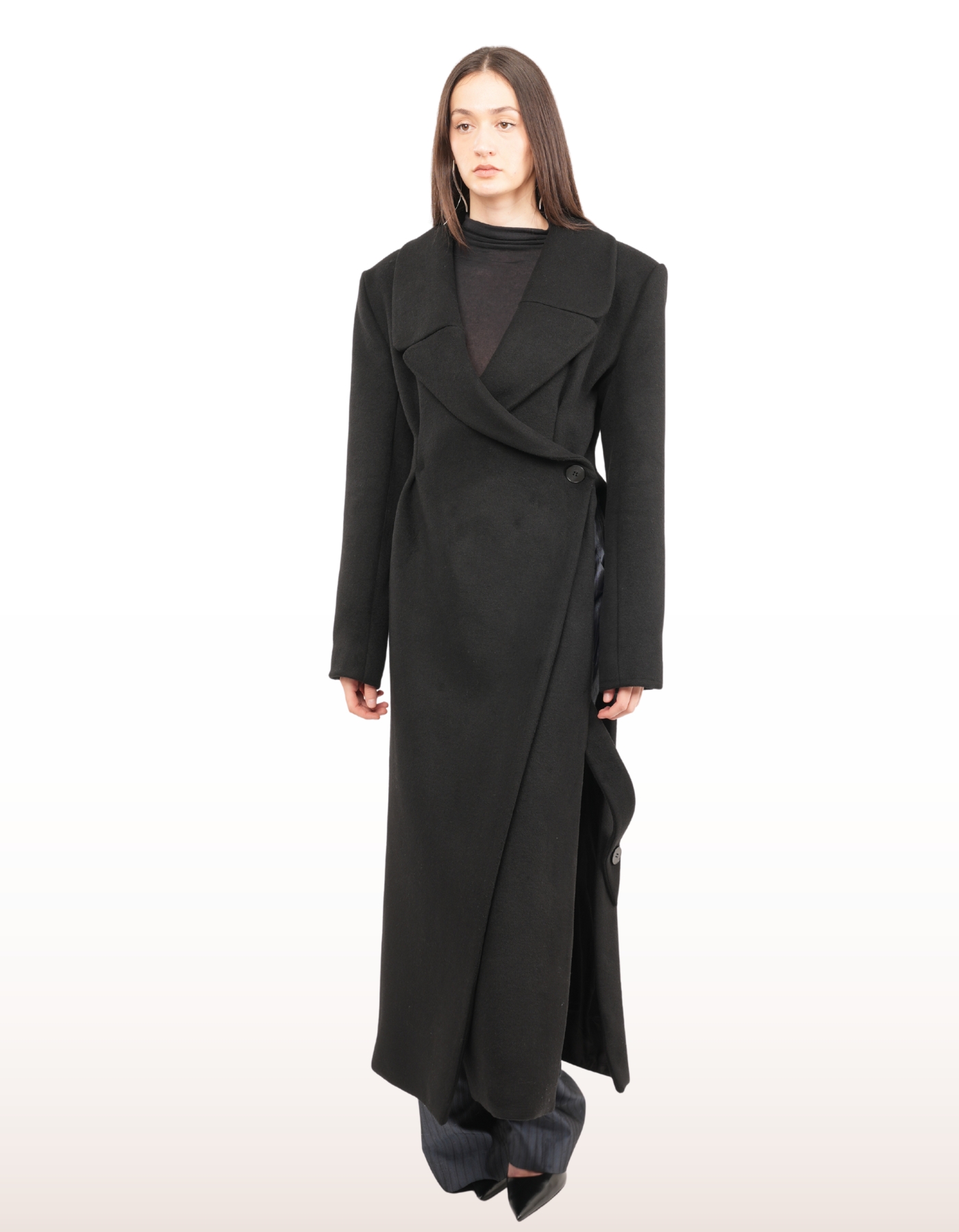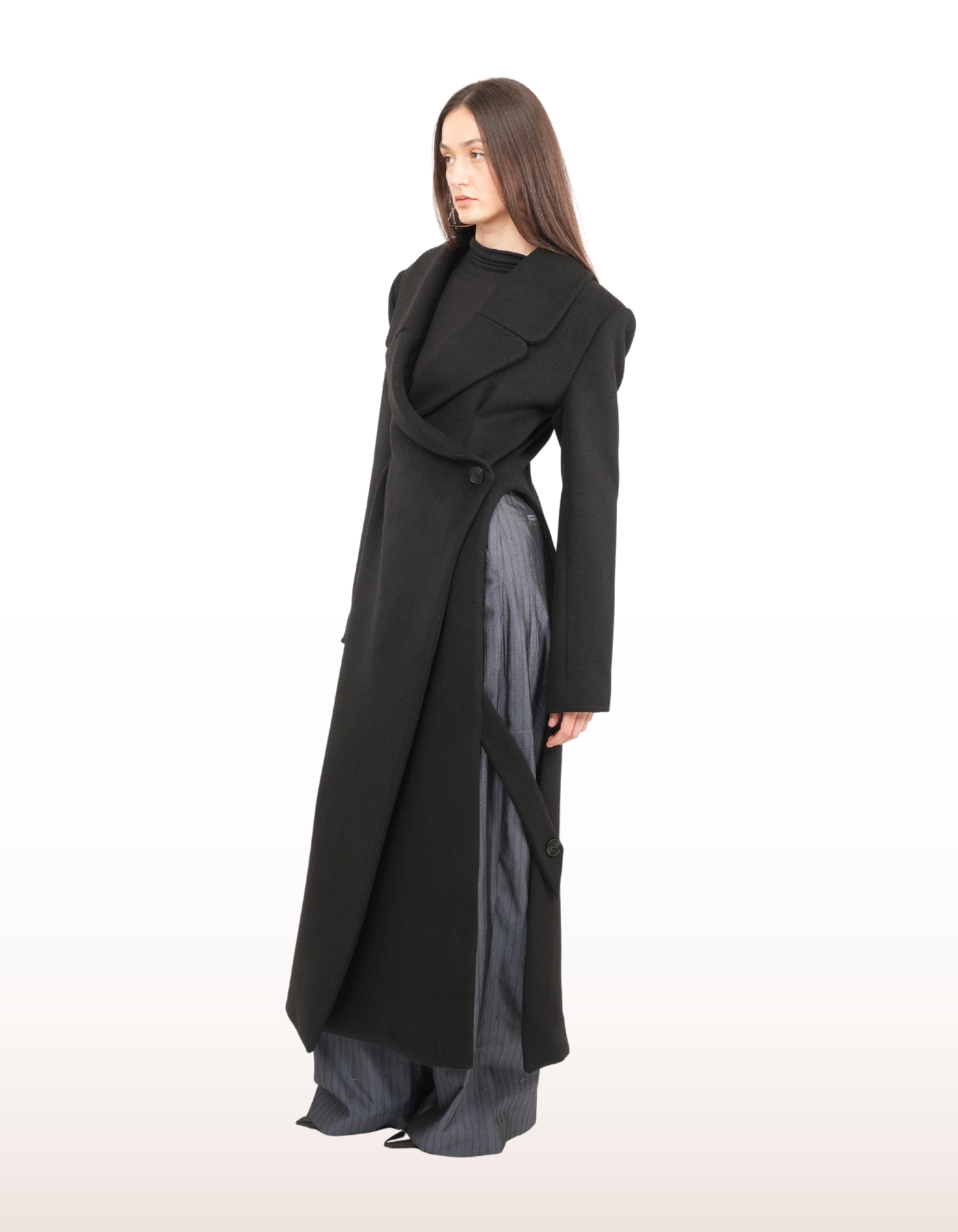 A floor-length wrap coat designed to merge architectural structure with fluid movement. Features a wide lapel, asymmetrical front closure with button fastening, and long structured sleeves. Finished with a side slit for dynamic styling and ease of motion.