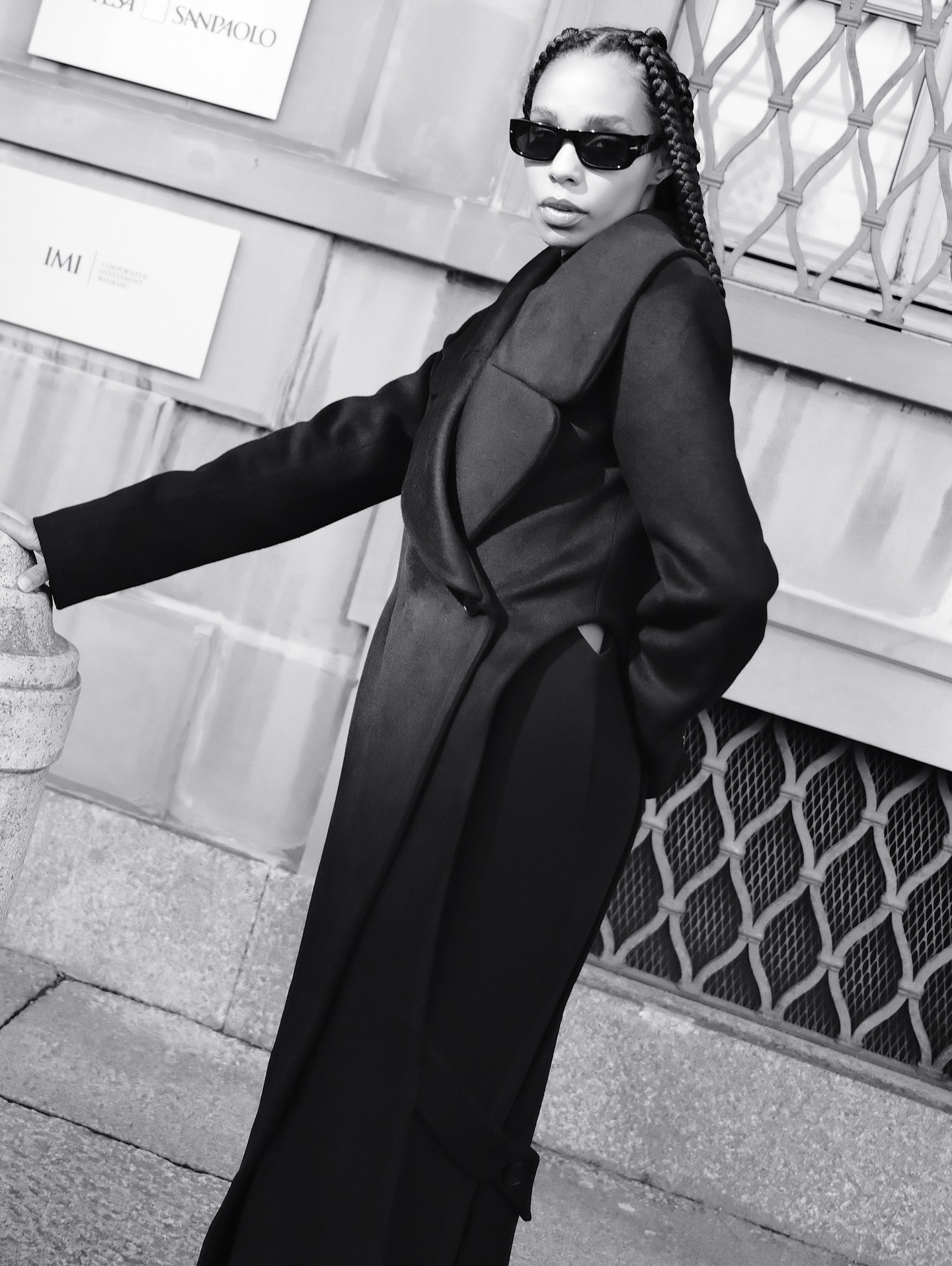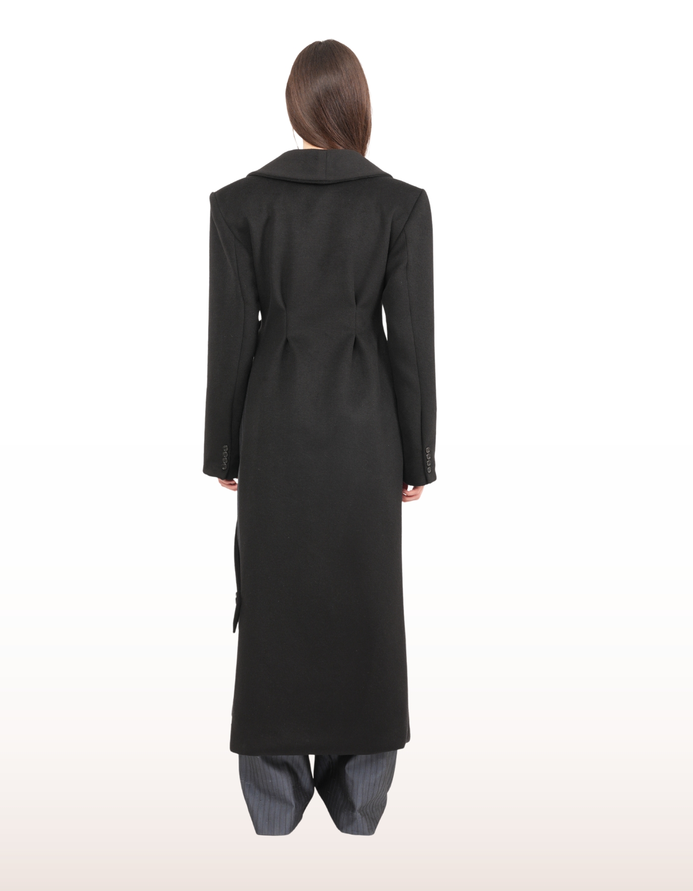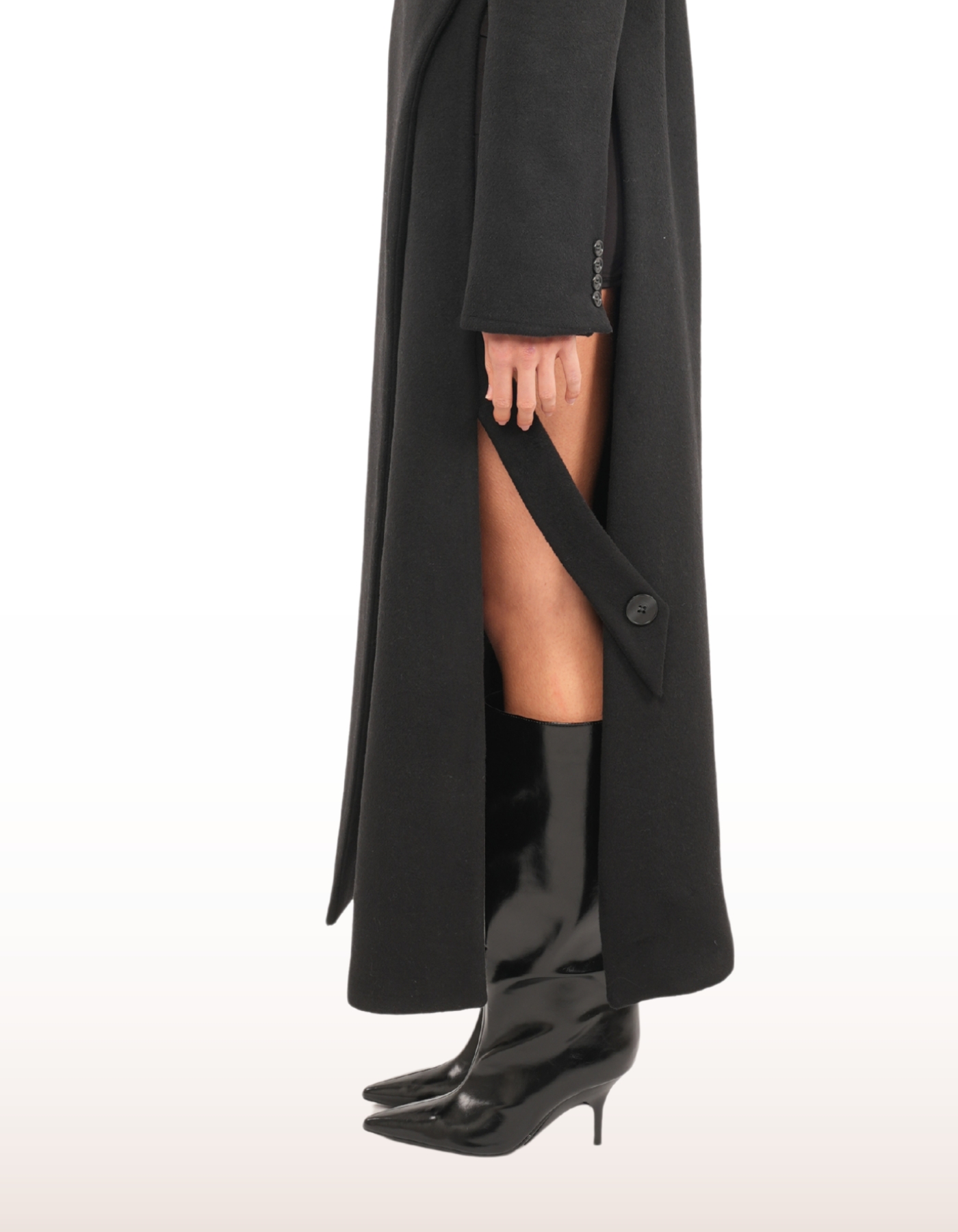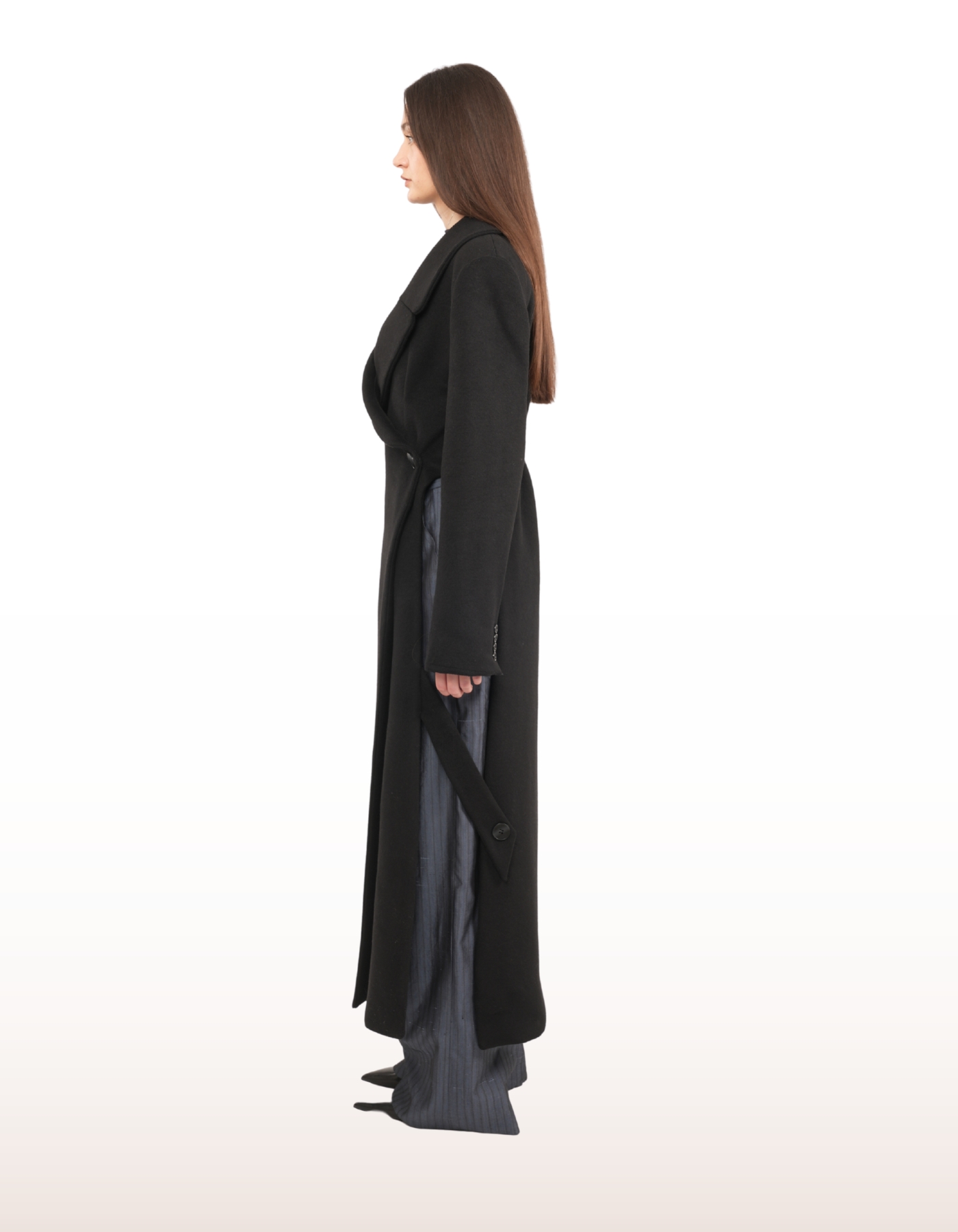 A floor-length wrap coat designed to merge architectural structure with fluid movement. Features a wide lapel, asymmetrical front closure with button fastening, and long structured sleeves. Finished with a side slit for dynamic styling and ease of motion.