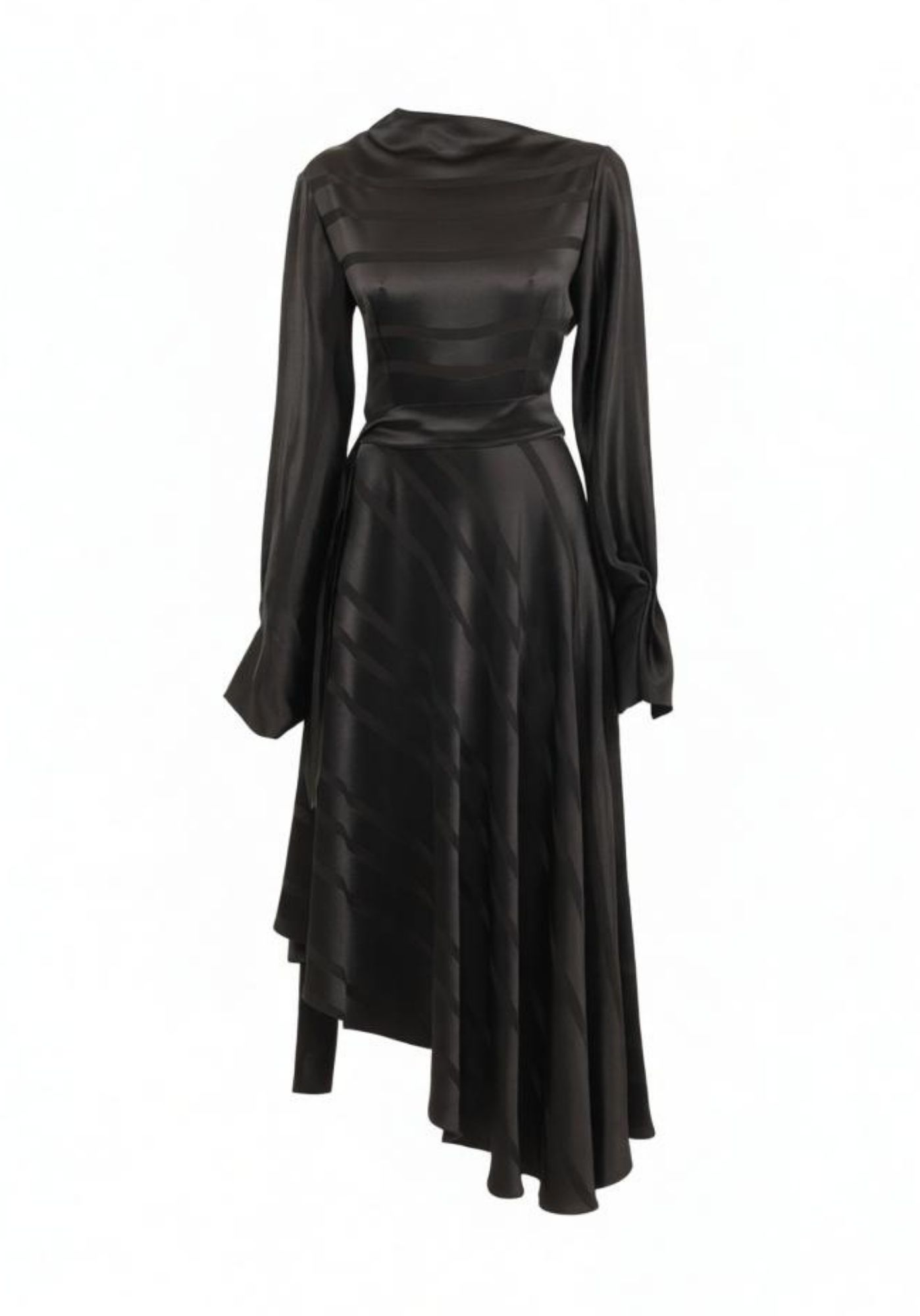 Asymmetric draped skirt creating natural movement.