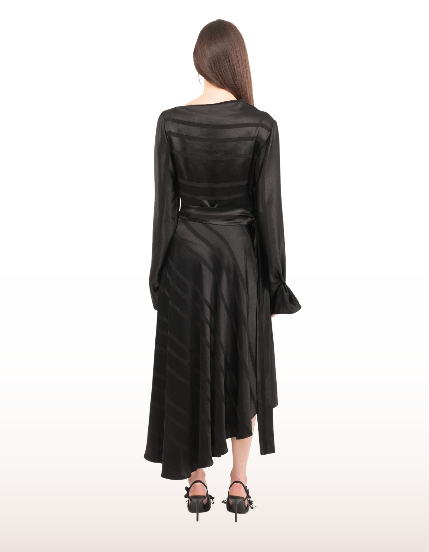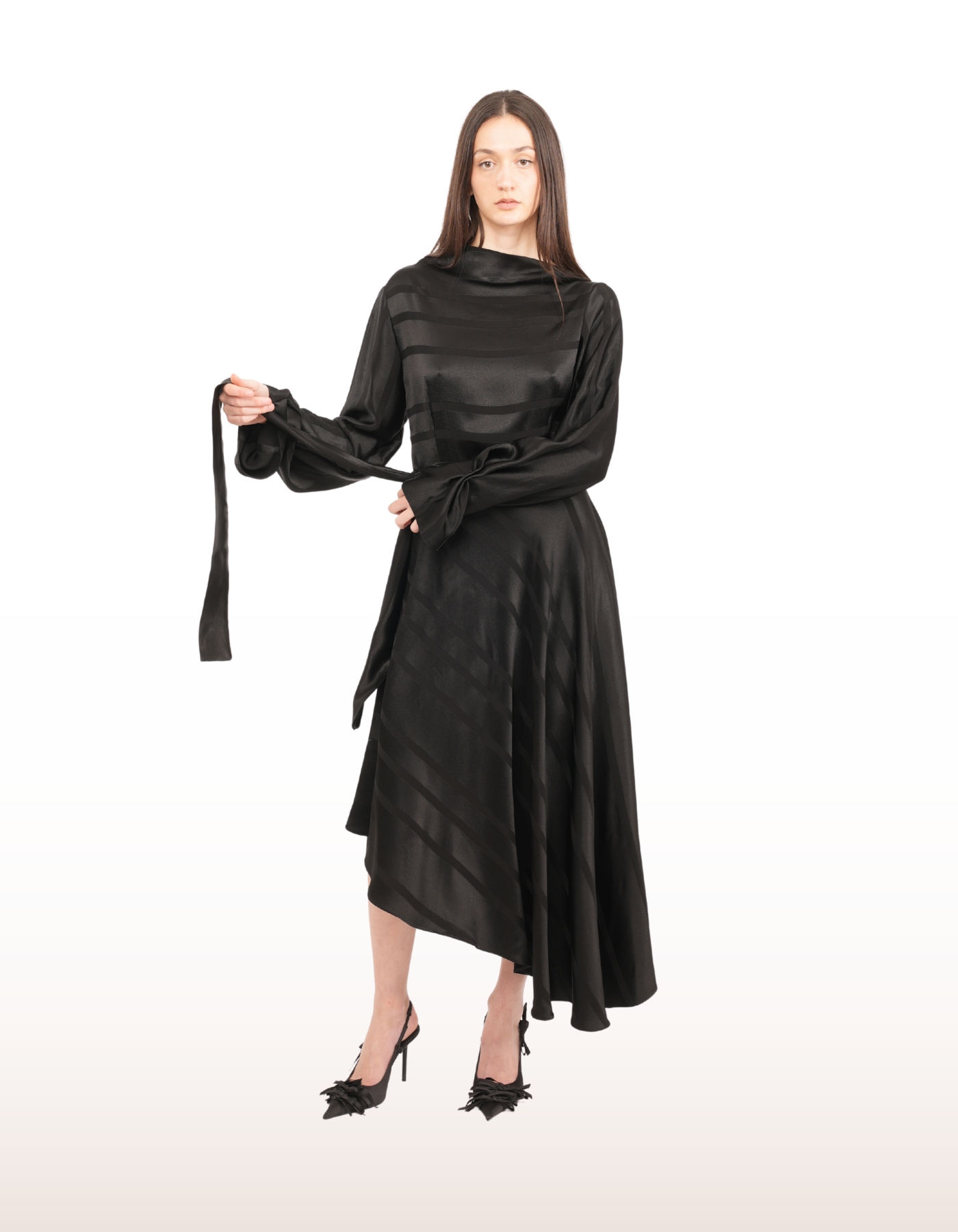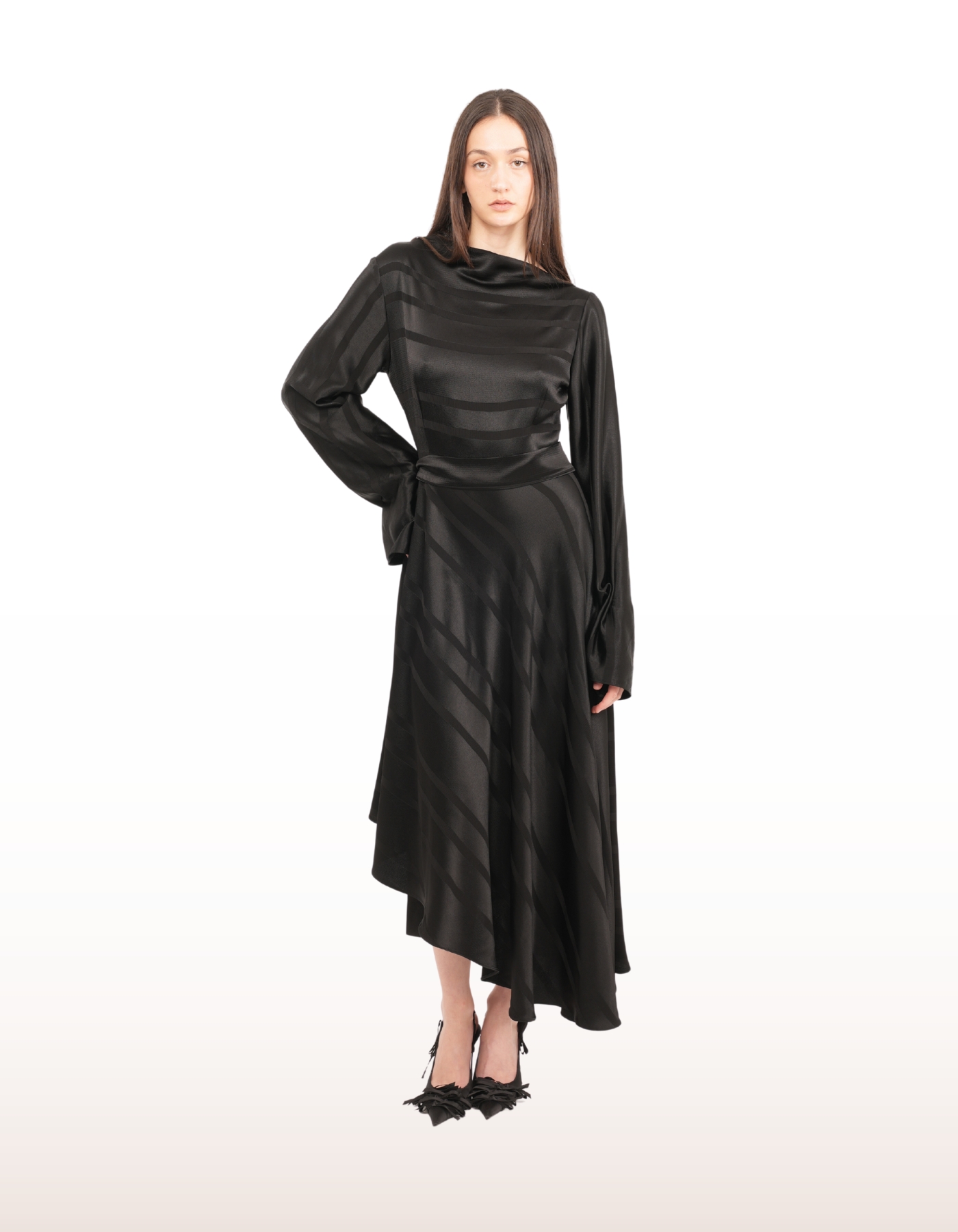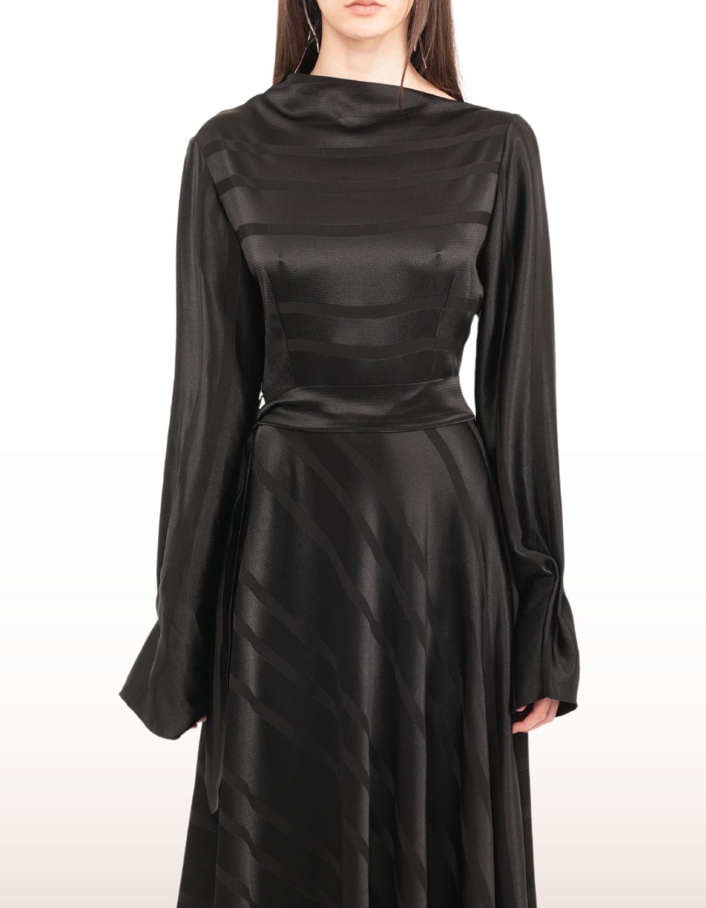 Draped neckline with fluid long sleeves.