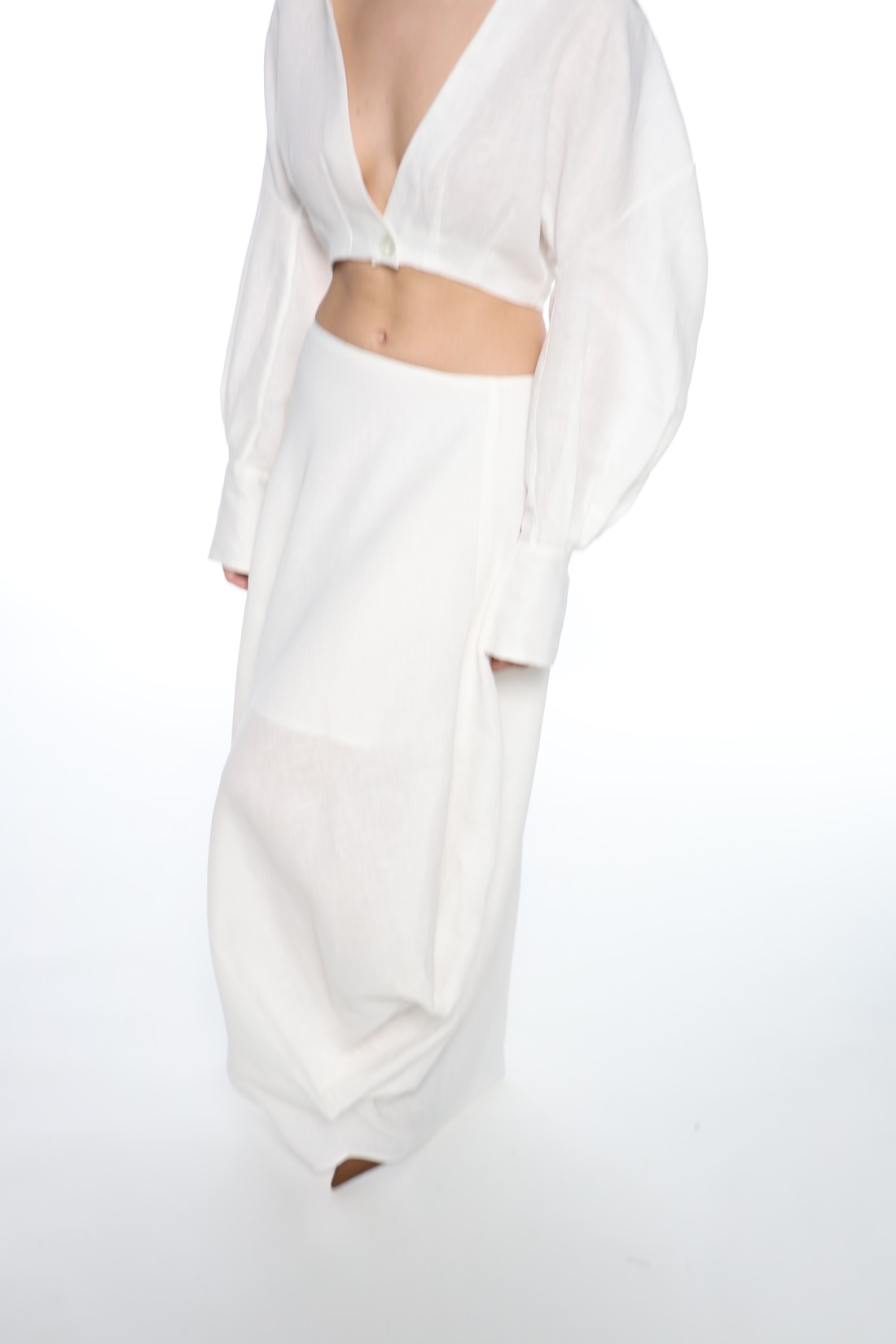 High-waisted skirt in white linen, designed with soft volume and an asymmetrical drape.