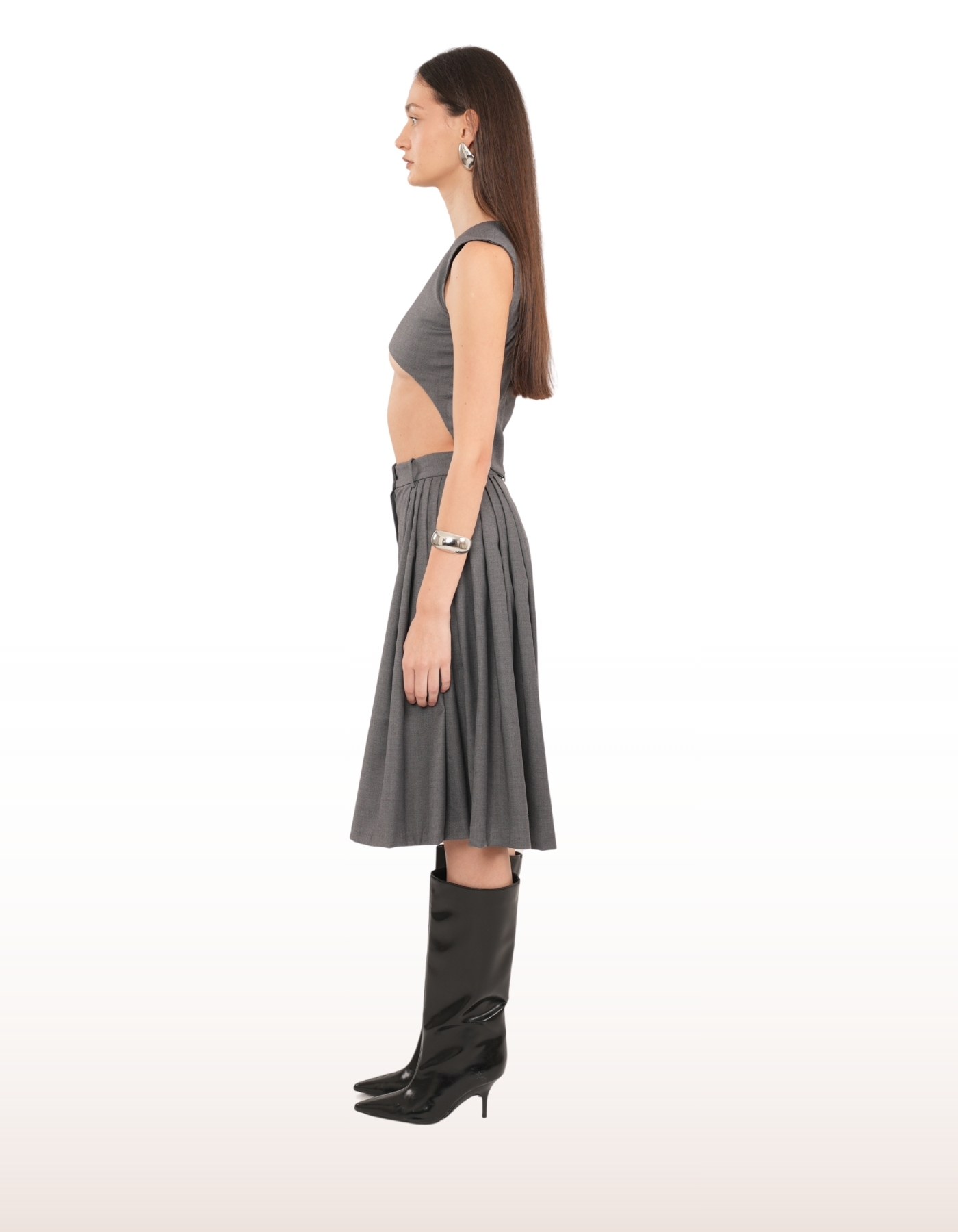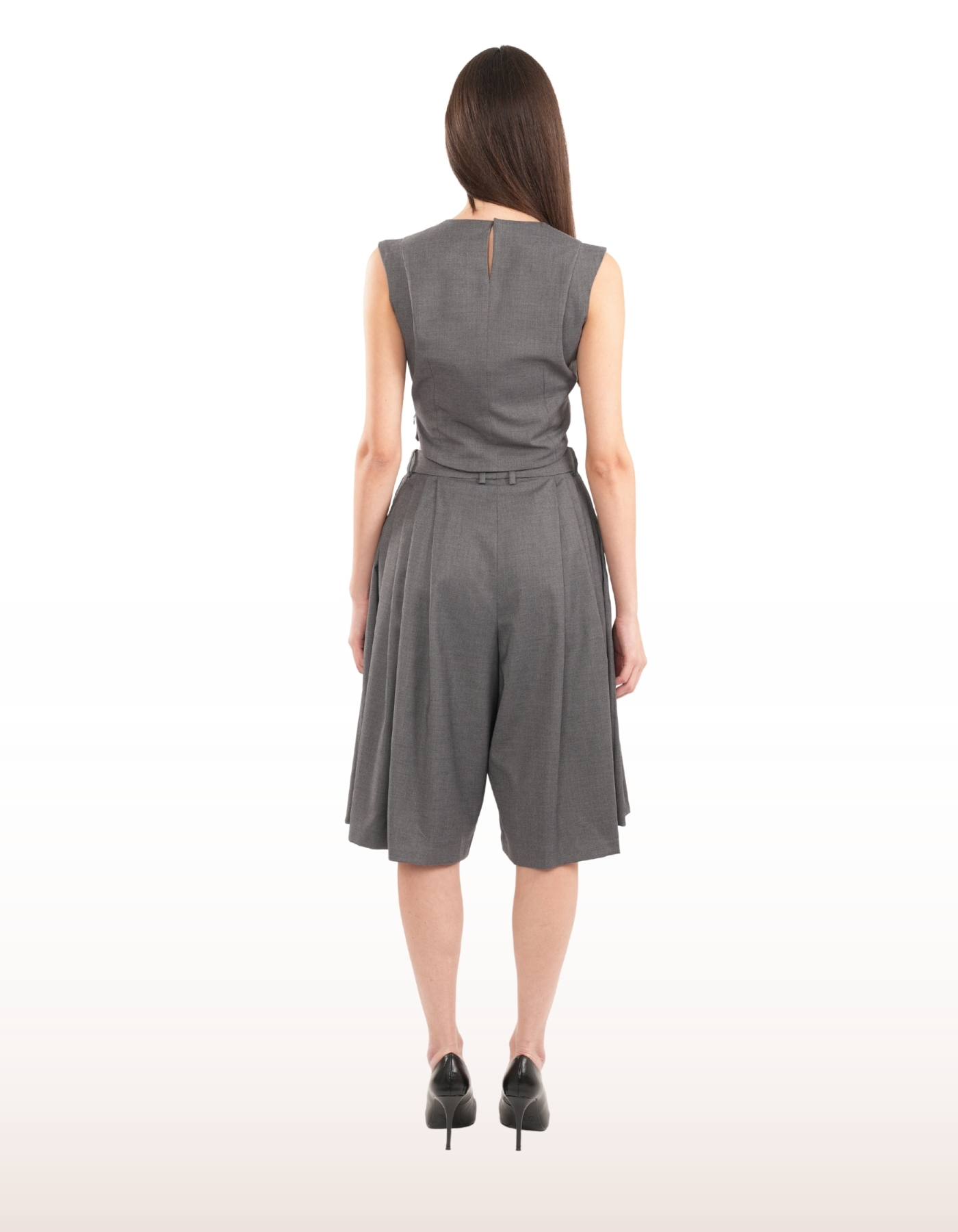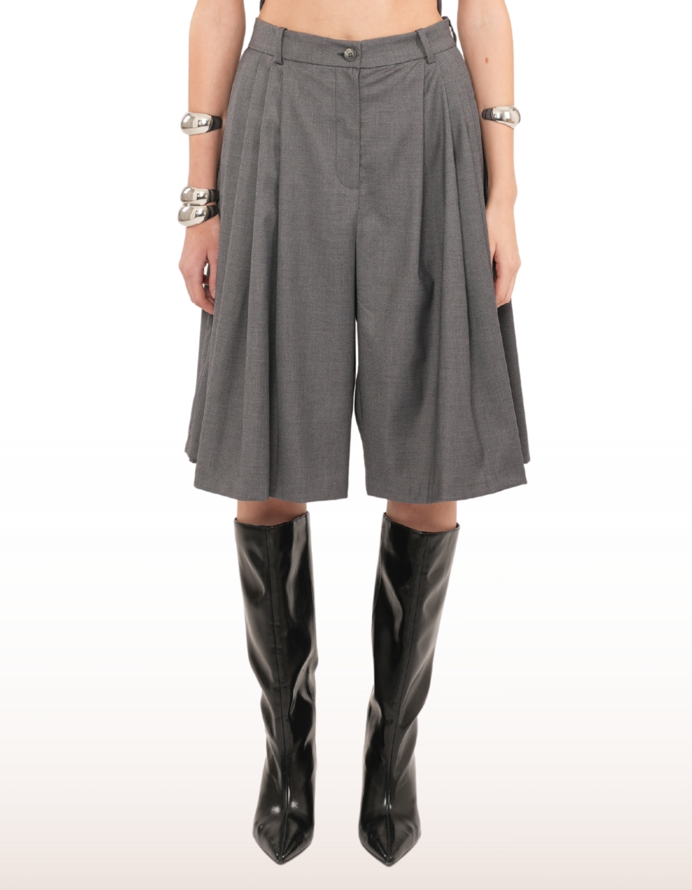 High-waisted culottes with structured pleats and a knee-length, skirt-like silhouette.